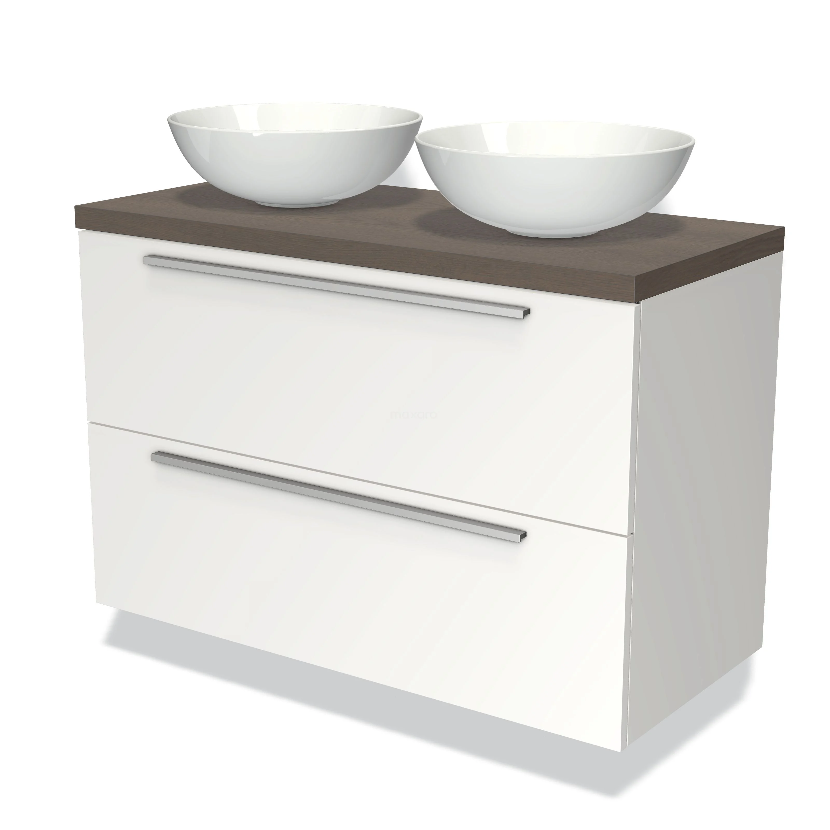 Modulo Plato Badmöbel mit Aufsatzwaschbecken | 100 cm Matt Weiß Flach front Dunkelbraune Eiche blatt 2 übereinanderliegende Schubladen