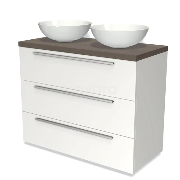 Modulo Plato Badmöbel mit Aufsatzwaschbecken | 100 cm Matt Weiß Flach front Dunkelbraune Eiche blatt 3 Schubladen