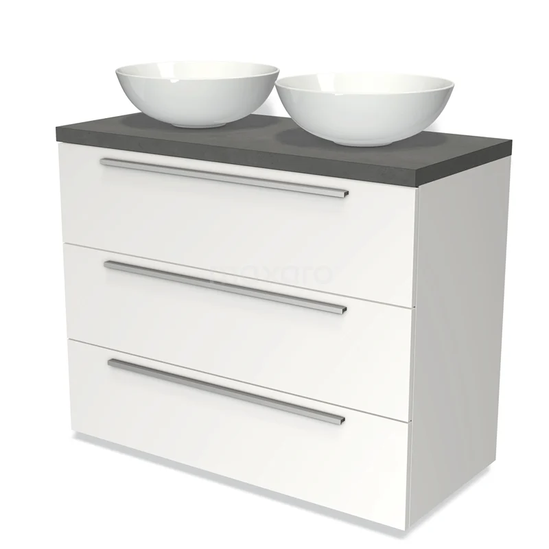Modulo Plato Badmöbel mit Aufsatzwaschbecken | 100 cm Matt Weiß Flach front Dunkelgrauer Beton blatt 3 Schubladen
