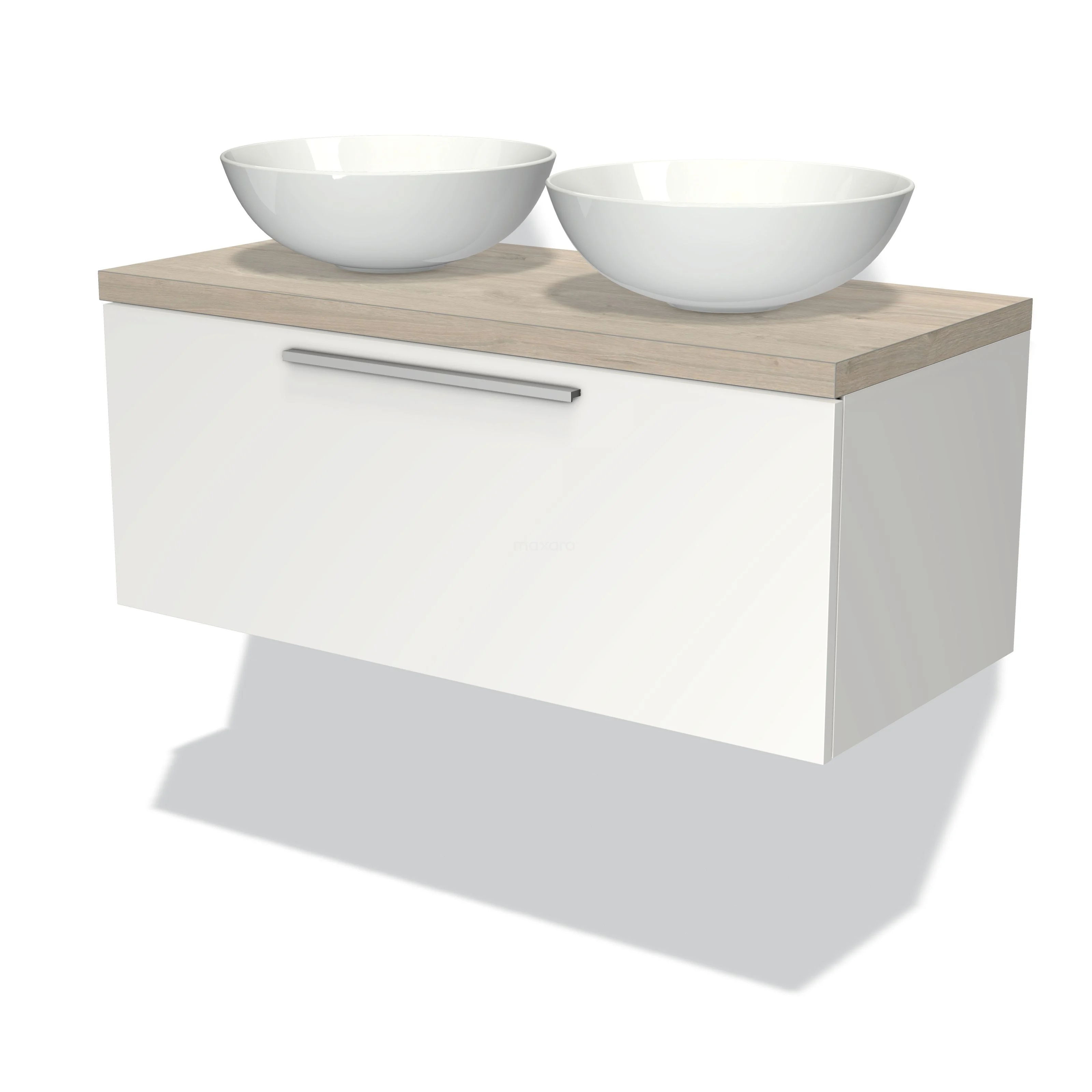 Modulo Plato Badmöbel mit Aufsatzwaschbecken | 100 cm Matt Weiß Flach front Hellgraue Eiche blatt 1 Schublade