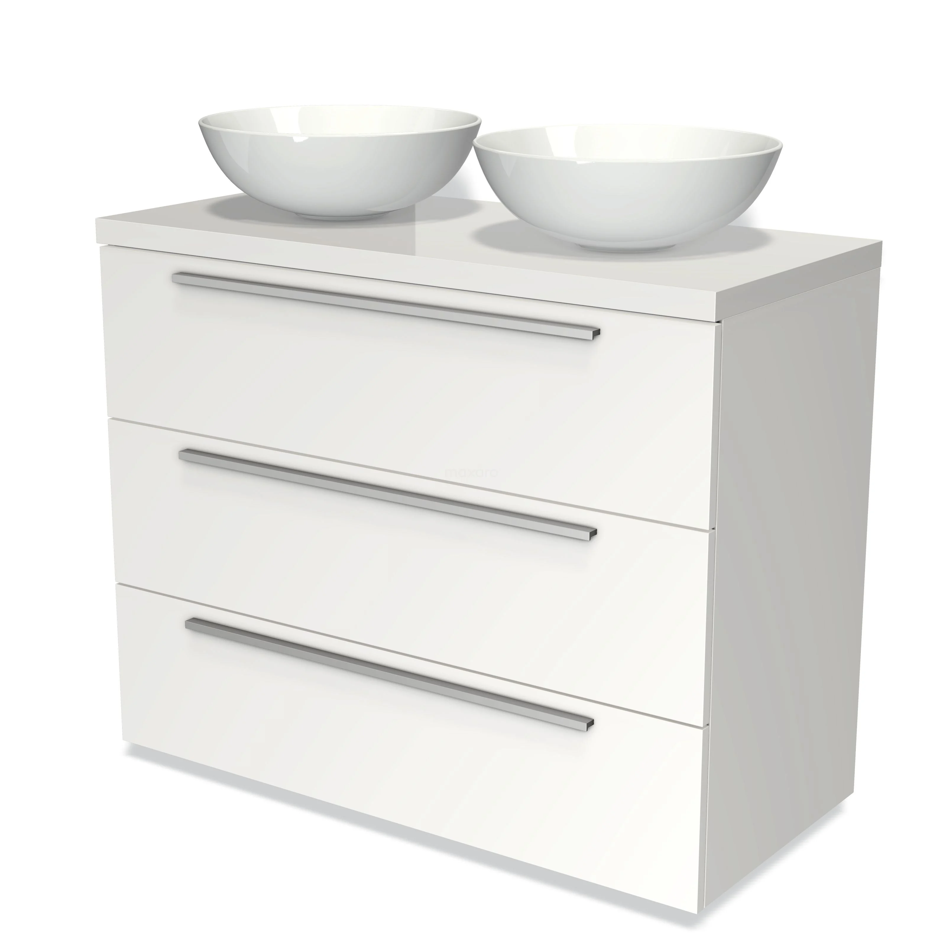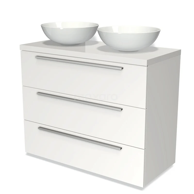 Modulo Plato Badmöbel mit Aufsatzwaschbecken | 100 cm Matt Weiß Flach front Hochglanz Weiß blatt 3 Schubladen