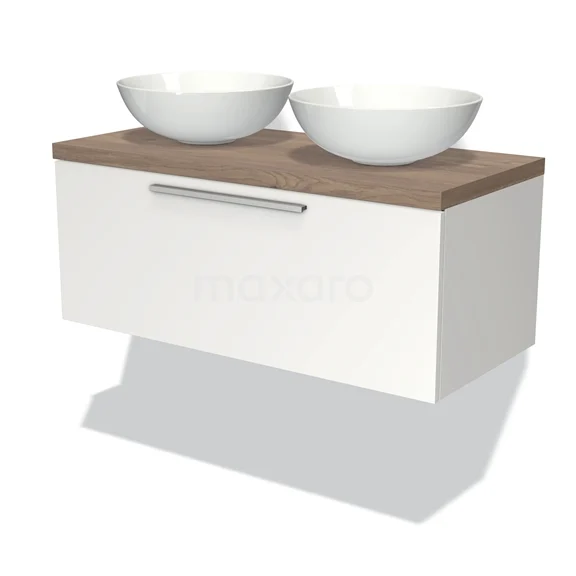 Modulo Plato Badmöbel mit Aufsatzwaschbecken | 100 cm Matt Weiß Flach front Mittelbraune Eiche blatt 1 Schublade