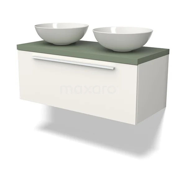 Modulo Plato Badmöbel mit Aufsatzwaschbecken | 100 cm Matt Weiß Flach front Salbeigrün blatt 1 Schublade