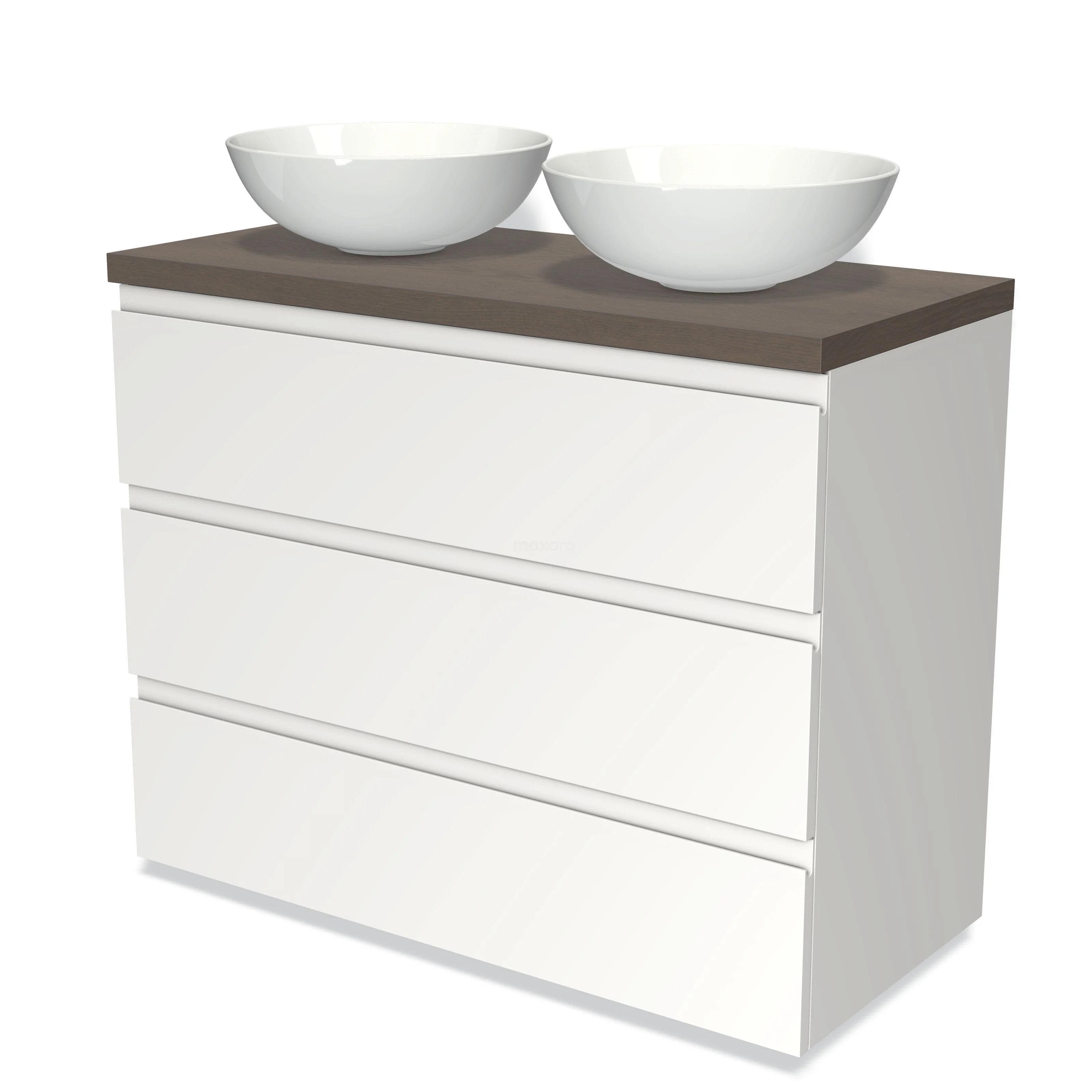 Modulo Plato Badmöbel mit Aufsatzwaschbecken | 100 cm Matt Weiß Grifflos front Dunkelbraune Eiche blatt 3 Schubladen