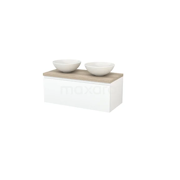 Modulo+ Plato Badmöbel mit Aufsatzwaschbecken | 100 cm Matt Weiß Grifflos front Eiche blatt 1 Schublade