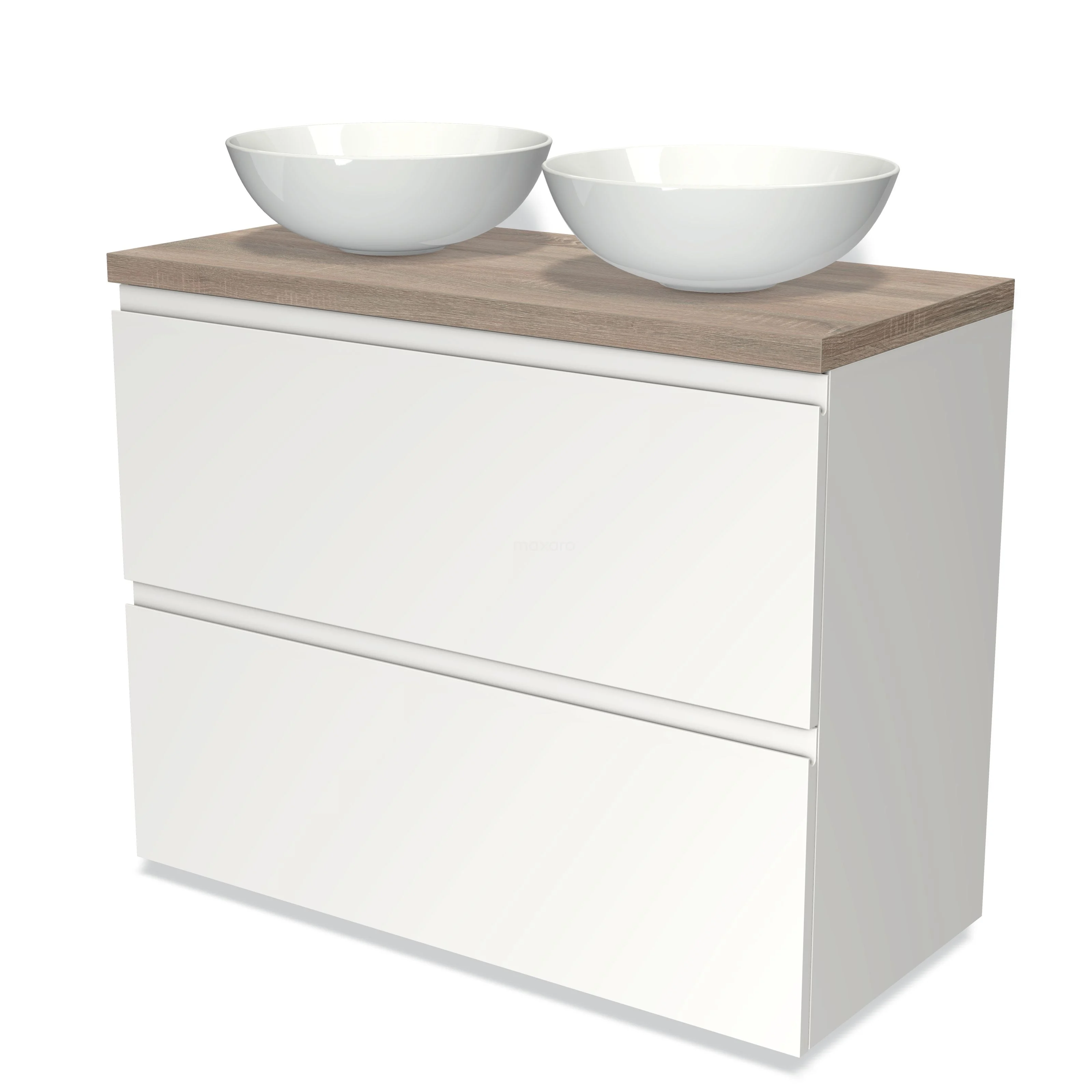 Modulo Plato Badmöbel mit Aufsatzwaschbecken | 100 cm Matt Weiß Grifflos front Eiche blatt 2 hohe Schubladen übereinanderliegend