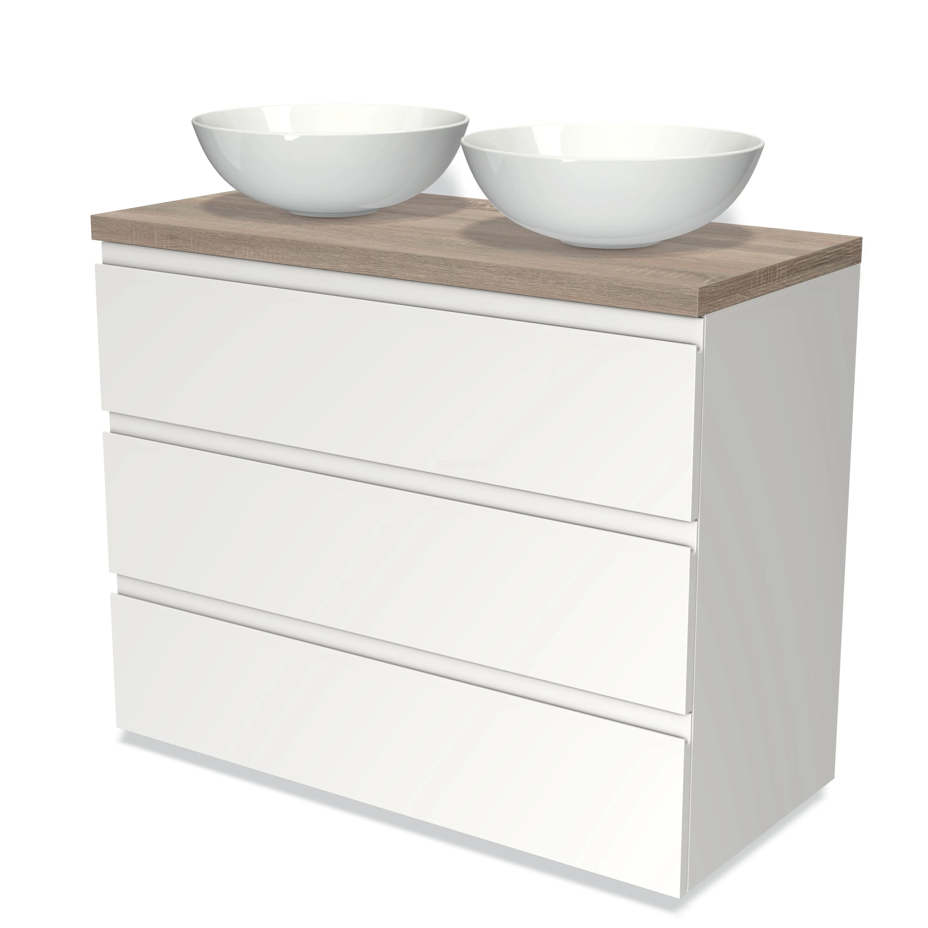 Modulo Plato Badmöbel mit Aufsatzwaschbecken | 100 cm Matt Weiß Grifflos front Eiche blatt 3 Schubladen
