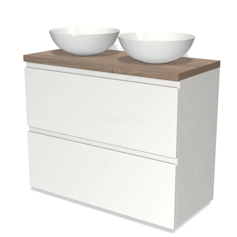 Modulo Plato Badmöbel mit Aufsatzwaschbecken | 100 cm Matt Weiß Grifflos front Mittelbraune Eiche blatt 2 hohe Schubladen übereinanderliegend