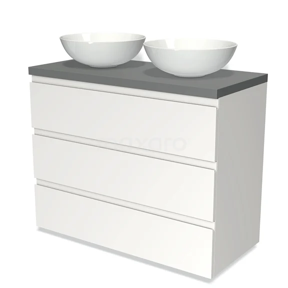 Modulo Plato Badmöbel mit Aufsatzwaschbecken | 100 cm Matt Weiß Grifflos front Mittelgrau blatt 3 Schubladen