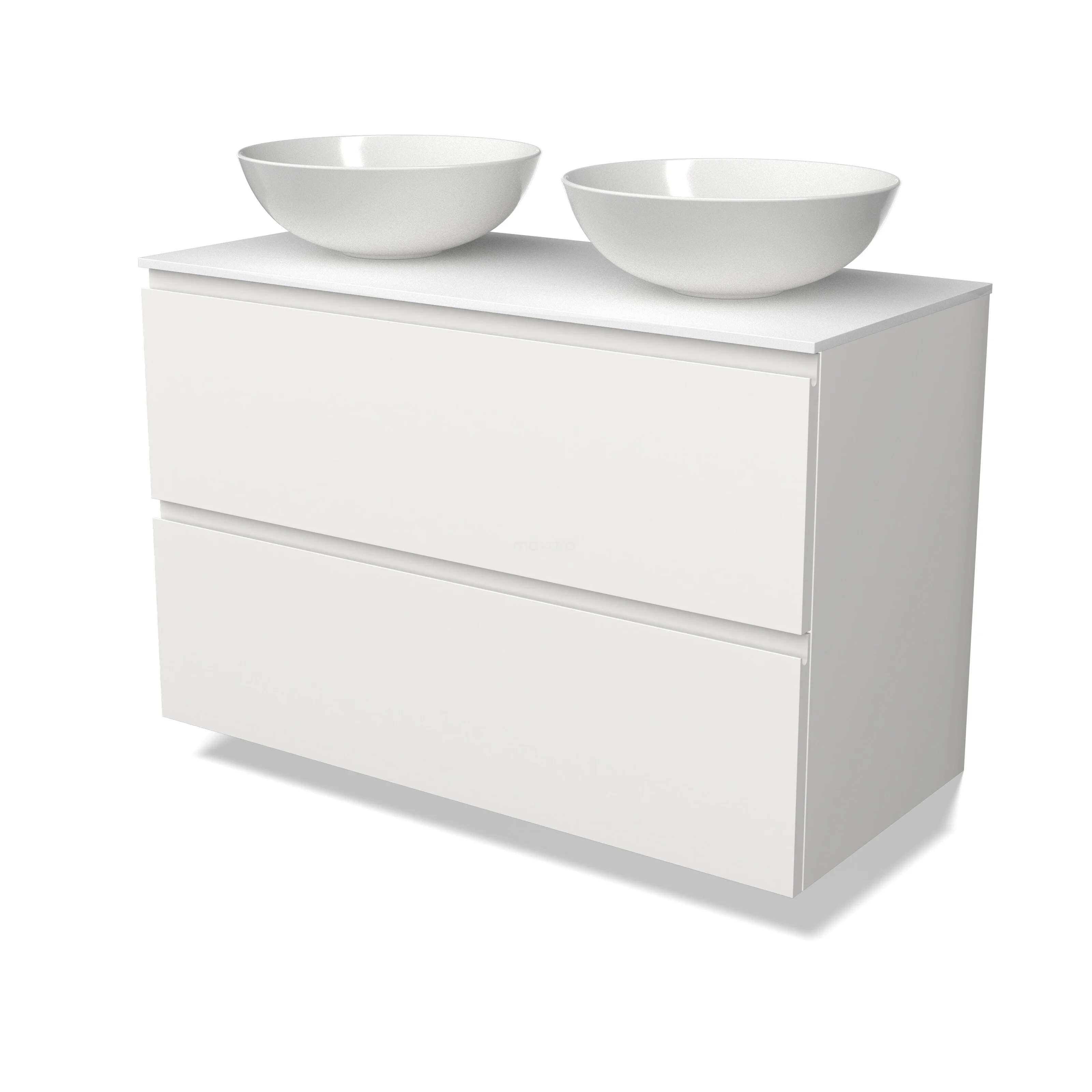 Modulo Plato Badmöbel mit Aufsatzwaschbecken | 100 cm Matt Weiß Grifflos front Solid Surface blatt 2 übereinanderliegende Schubladen