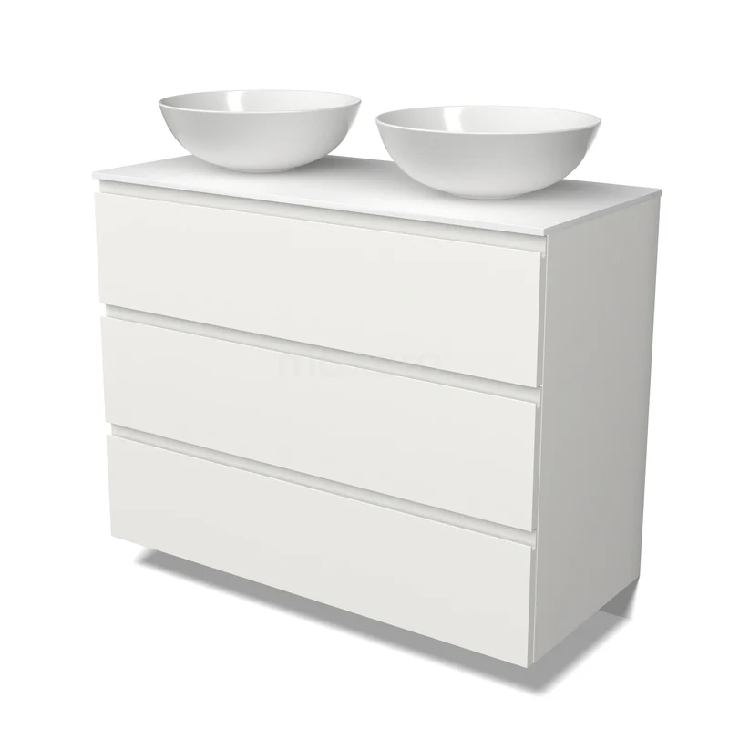 Modulo Plato Badmöbel mit Aufsatzwaschbecken | 100 cm Matt Weiß Grifflos front Solid Surface blatt 3 Schubladen