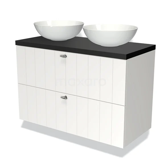 Modulo Plato Badmöbel mit Aufsatzwaschbecken | 100 cm Matt Weiß Lamelle front Matt Schwarz blatt 2 übereinanderliegende Schubladen