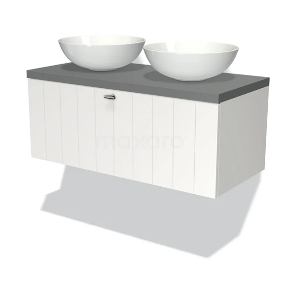 Modulo Plato Badmöbel mit Aufsatzwaschbecken | 100 cm Matt Weiß Lamelle front Mittelgrau blatt 1 Schublade