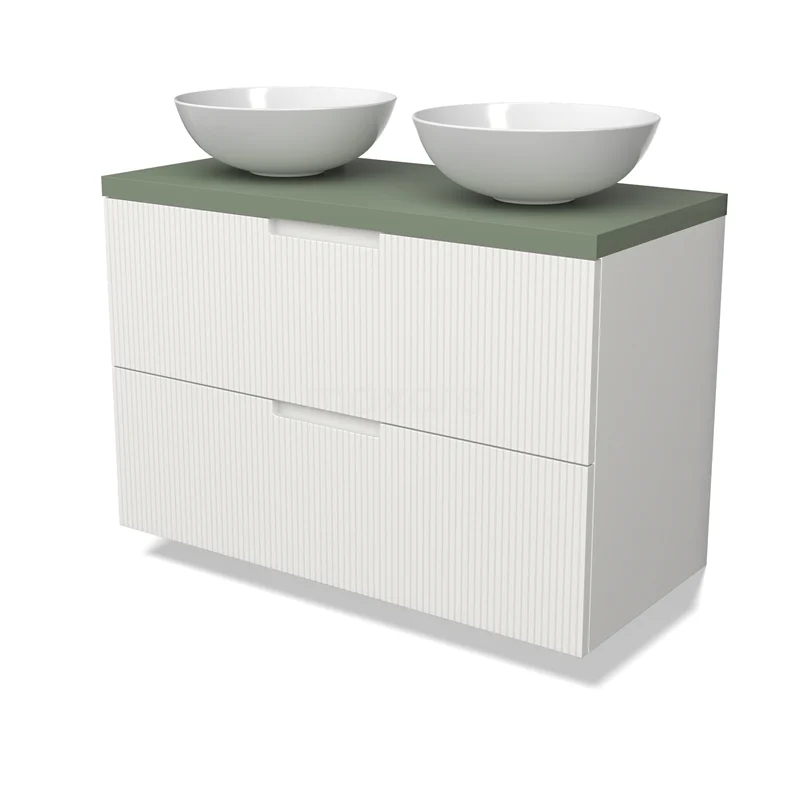 Modulo Plato Badmöbel mit Aufsatzwaschbecken | 100 cm Matt Weiß Linie front Salbeigrün blatt 2 übereinanderliegende Schubladen