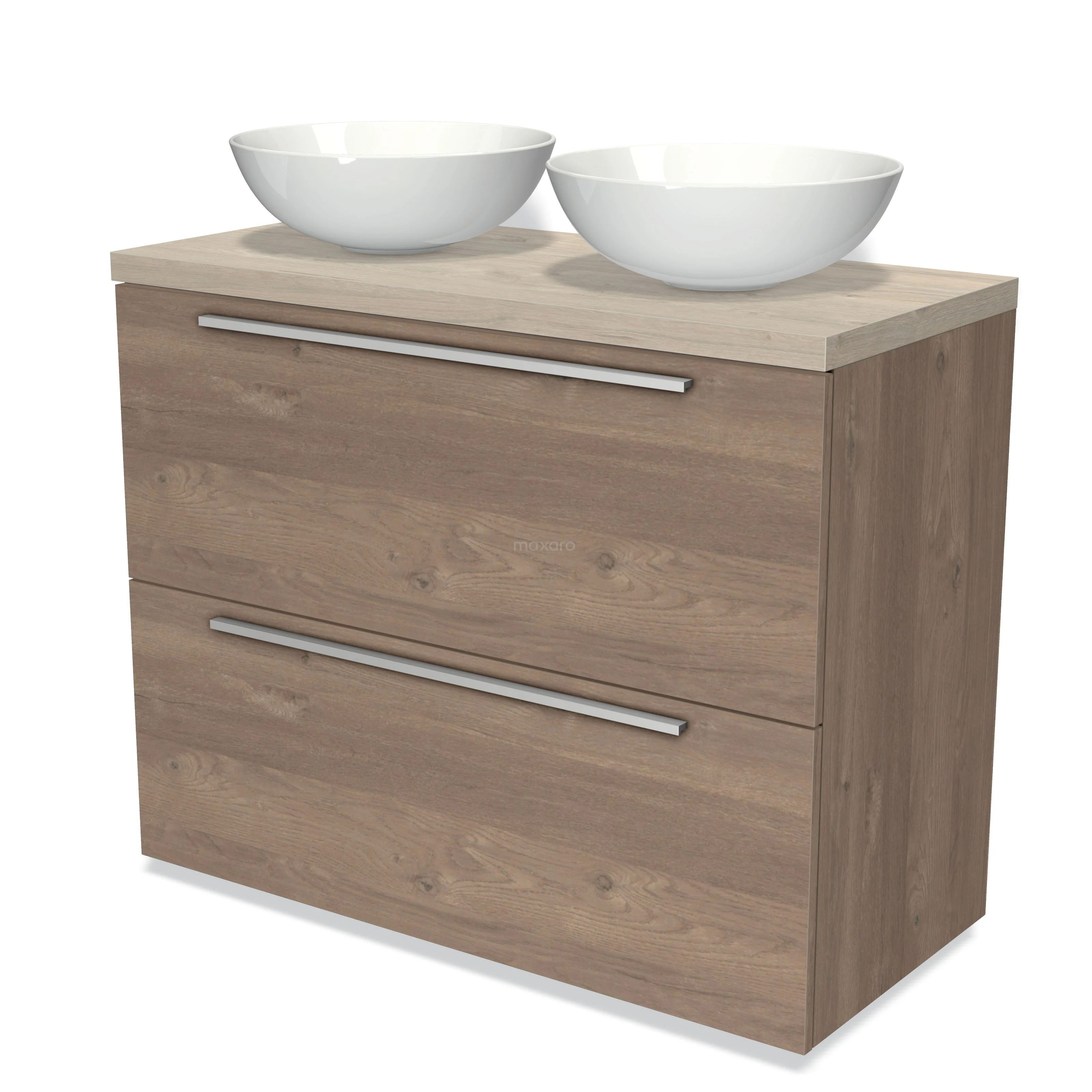Modulo Plato Badmöbel mit Aufsatzwaschbecken | 100 cm Mittelbraune Eiche Flach front Hellgraue Eiche blatt 2 hohe Schubladen übereinanderliegend