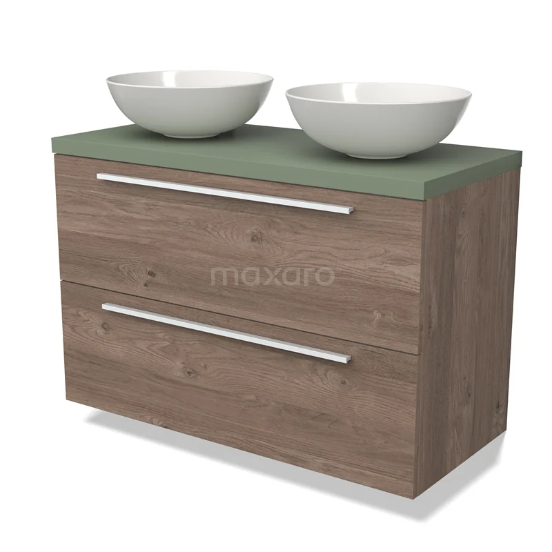Modulo Plato Badmöbel mit Aufsatzwaschbecken | 100 cm Mittelbraune Eiche Flach front Salbeigrün blatt 2 übereinanderliegende Schubladen