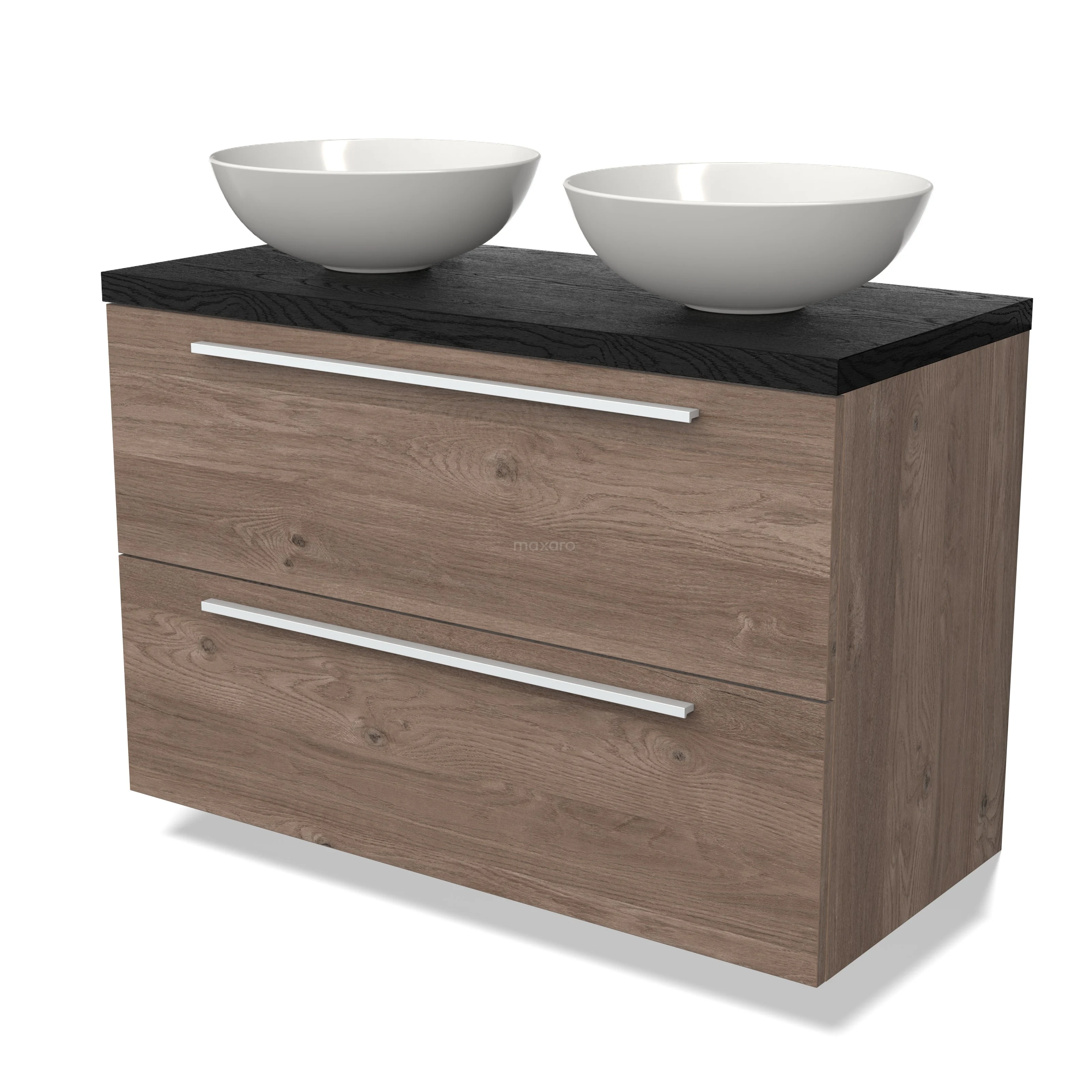 Modulo Plato Badmöbel mit Aufsatzwaschbecken | 100 cm Mittelbraune Eiche Flach front Schwarze Eiche blatt 2 übereinanderliegende Schubladen