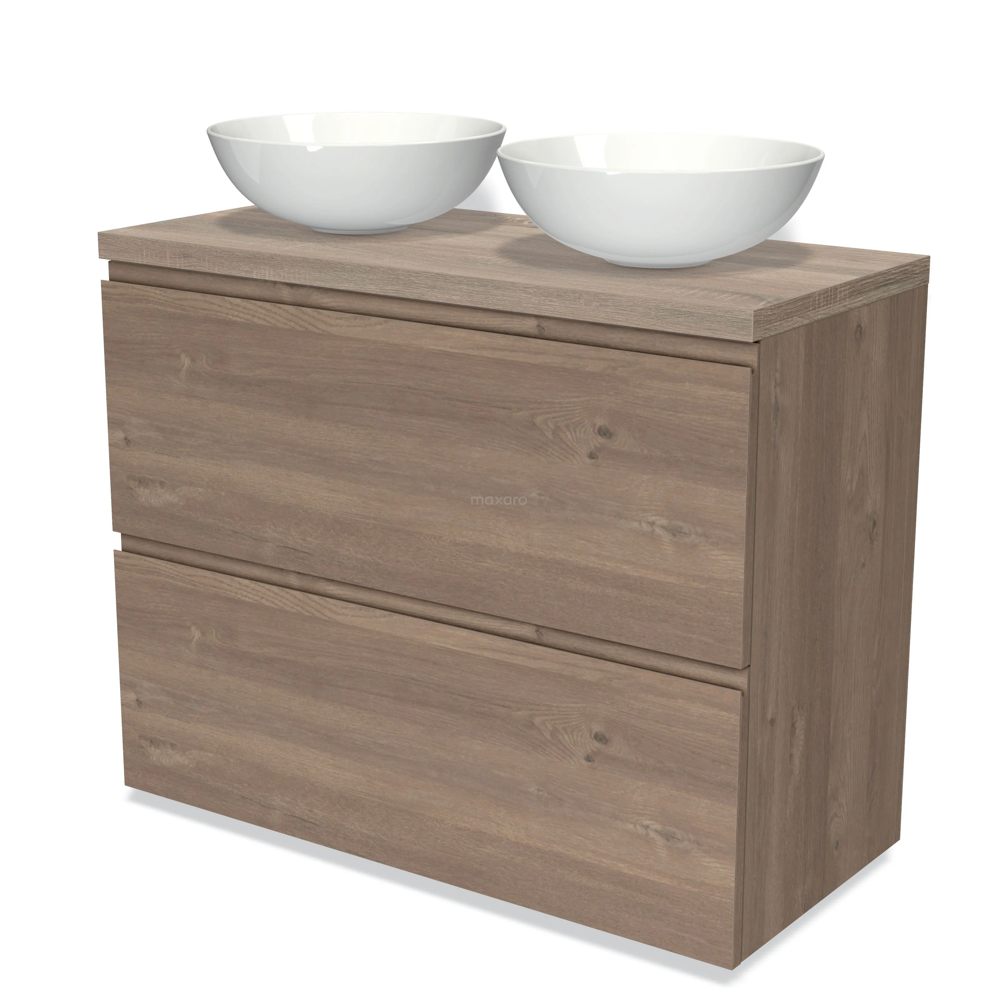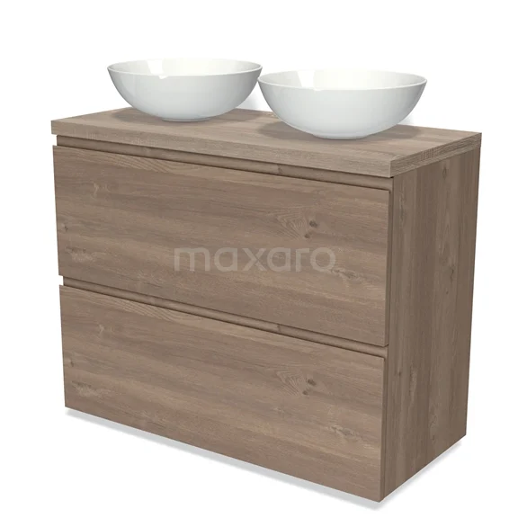 Modulo Plato Badmöbel mit Aufsatzwaschbecken | 100 cm Mittelbraune Eiche Grifflos front Eiche blatt 2 hohe Schubladen übereinanderliegend