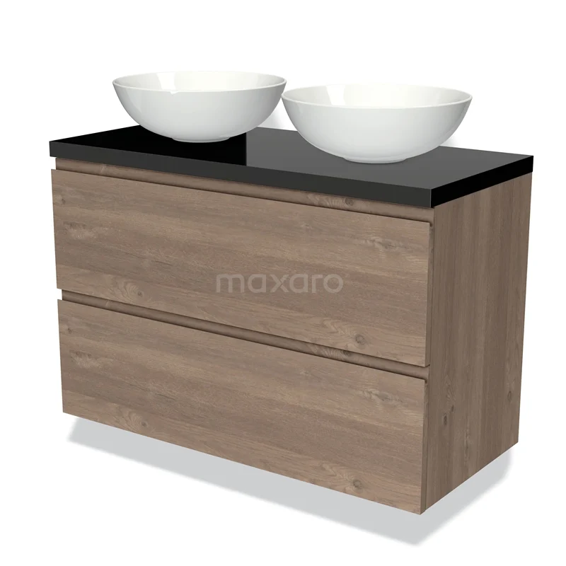 Modulo Plato Badmöbel mit Aufsatzwaschbecken | 100 cm Mittelbraune Eiche Grifflos front Hochglanz Schwarz blatt 2 übereinanderliegende Schubladen