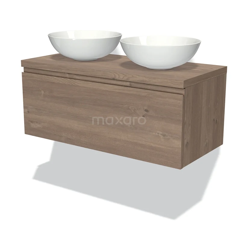 Modulo Plato Badmöbel mit Aufsatzwaschbecken | 100 cm Mittelbraune Eiche Grifflos front Mittelbraune Eiche blatt 1 Schublade