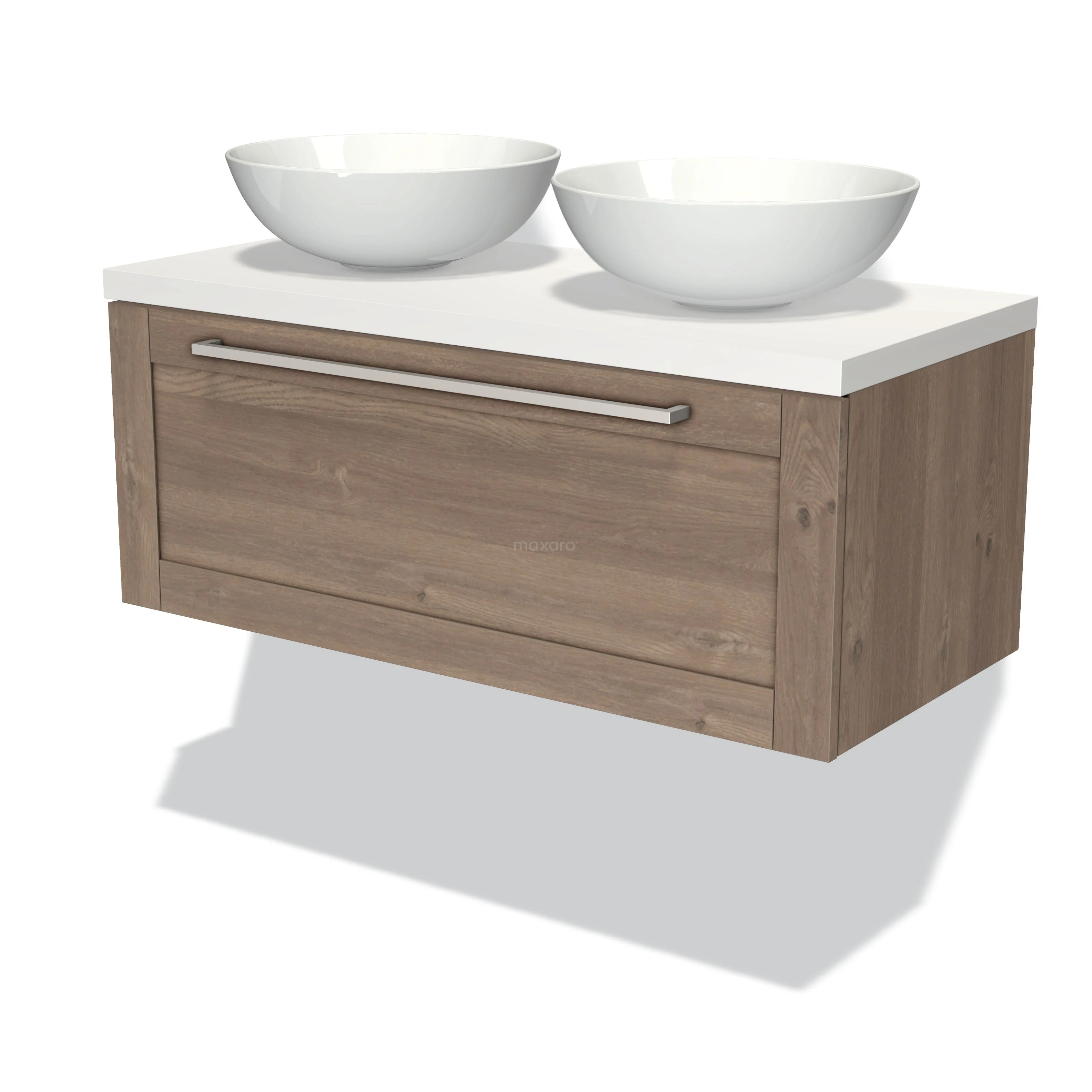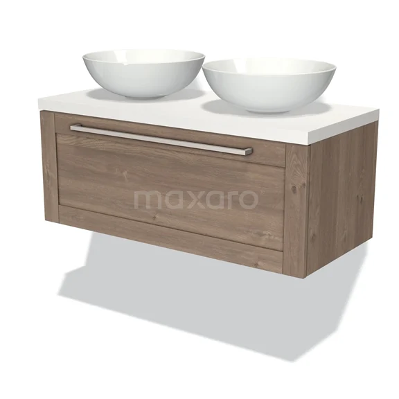 Modulo Plato Badmöbel mit Aufsatzwaschbecken | 100 cm Mittelbraune Eiche Rahmen front Matt Weiß blatt 1 Schublade