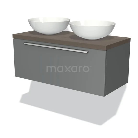 Modulo Plato Badmöbel mit Aufsatzwaschbecken | 100 cm Mittelgrau Flach front Dunkelbraune Eiche blatt 1 Schublade