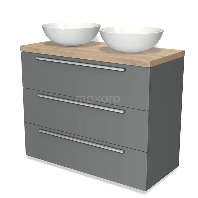 Modulo Plato Badmöbel mit Aufsatzwaschbecken | 100 cm Mittelgrau Flach front Hellbraune Eiche blatt 3 Schubladen