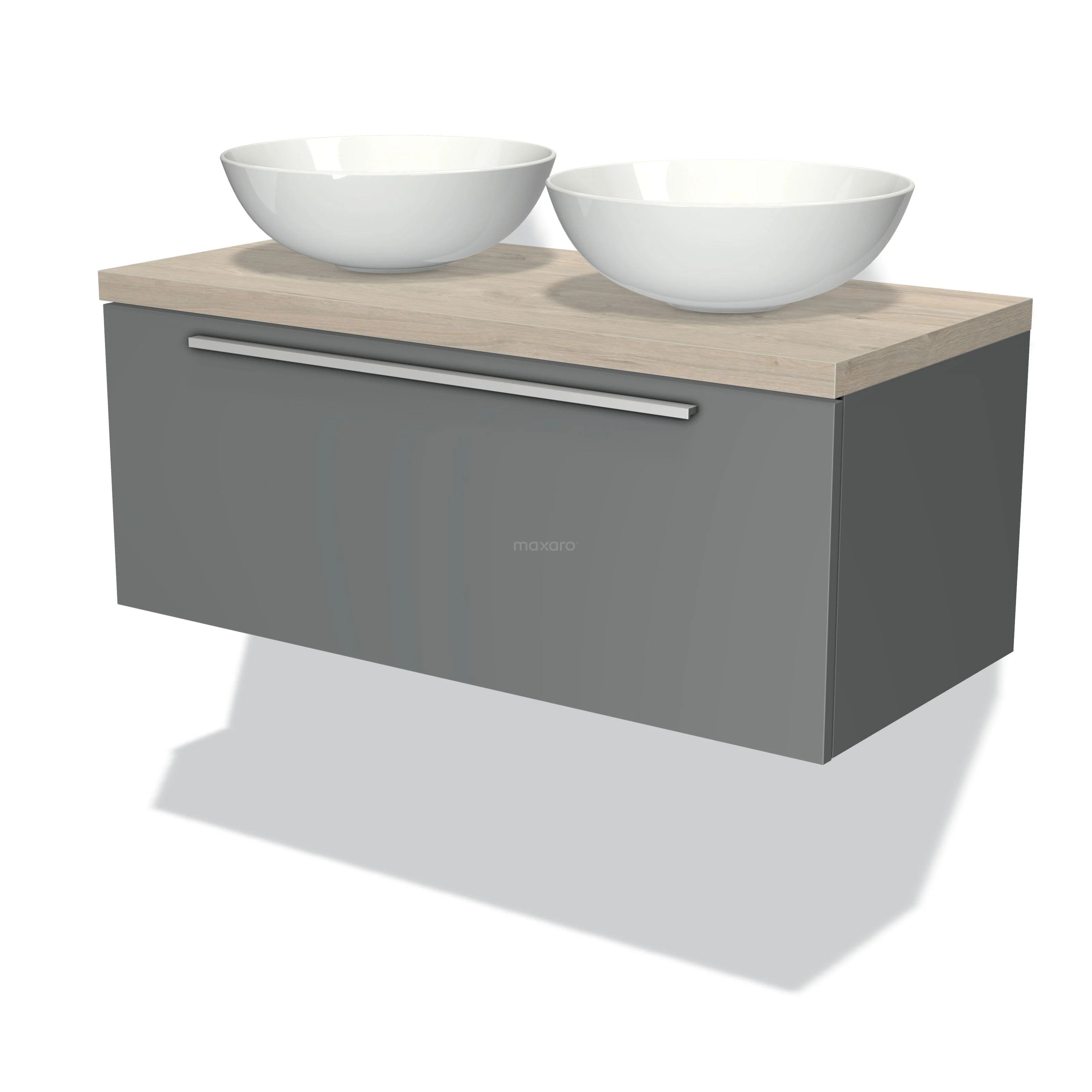 Modulo Plato Badmöbel mit Aufsatzwaschbecken | 100 cm Mittelgrau Flach front Hellgraue Eiche blatt 1 Schublade