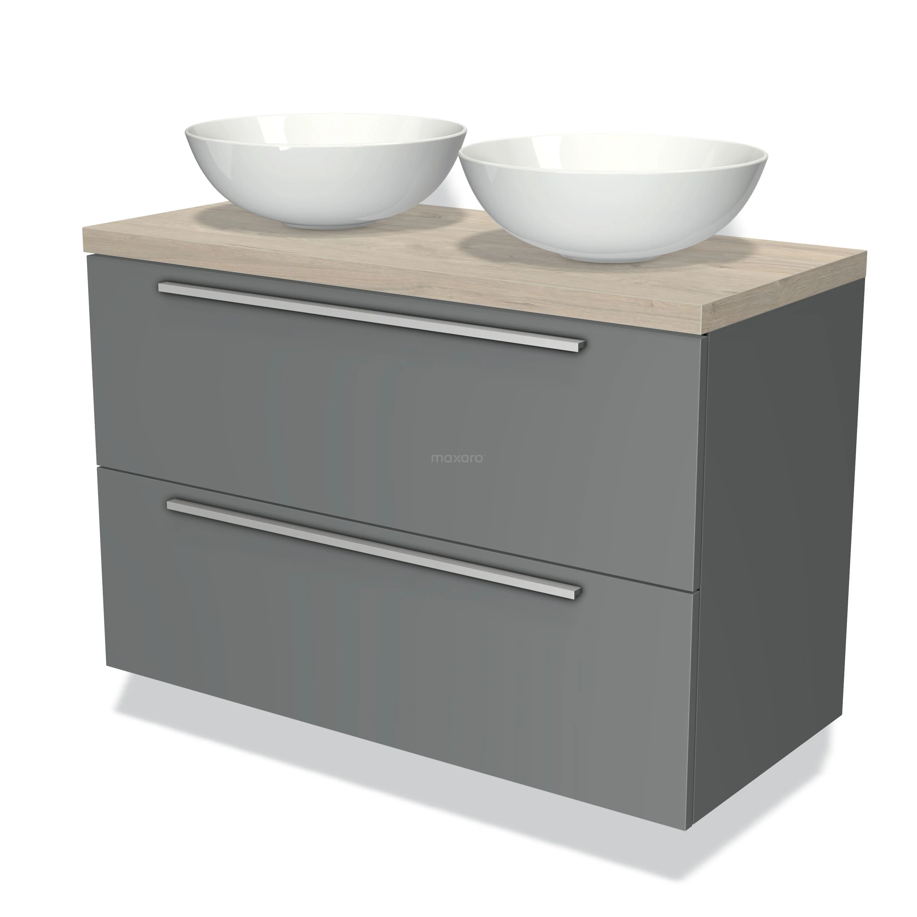 Modulo Plato Badmöbel mit Aufsatzwaschbecken | 100 cm Mittelgrau Flach front Hellgraue Eiche blatt 2 übereinanderliegende Schubladen