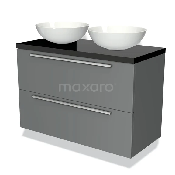 Modulo Plato Badmöbel mit Aufsatzwaschbecken | 100 cm Mittelgrau Flach front Hochglanz Schwarz blatt 2 übereinanderliegende Schubladen