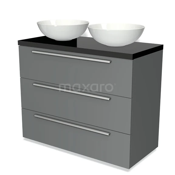Modulo Plato Badmöbel mit Aufsatzwaschbecken | 100 cm Mittelgrau Flach front Hochglanz Schwarz blatt 3 Schubladen