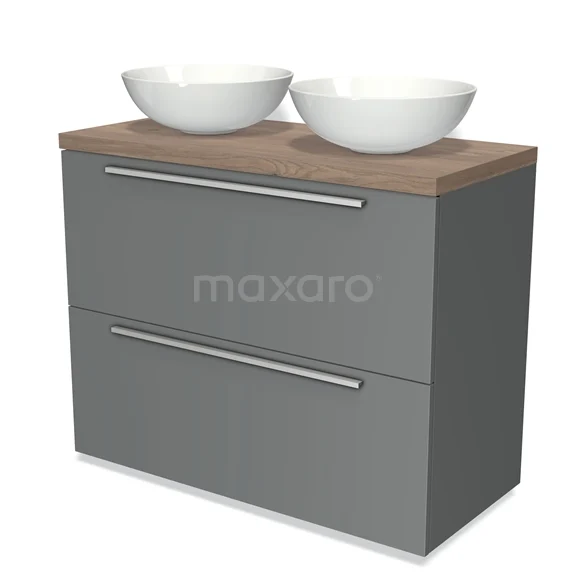 Modulo Plato Badmöbel mit Aufsatzwaschbecken | 100 cm Mittelgrau Flach front Mittelbraune Eiche blatt 2 hohe Schubladen übereinanderliegend
