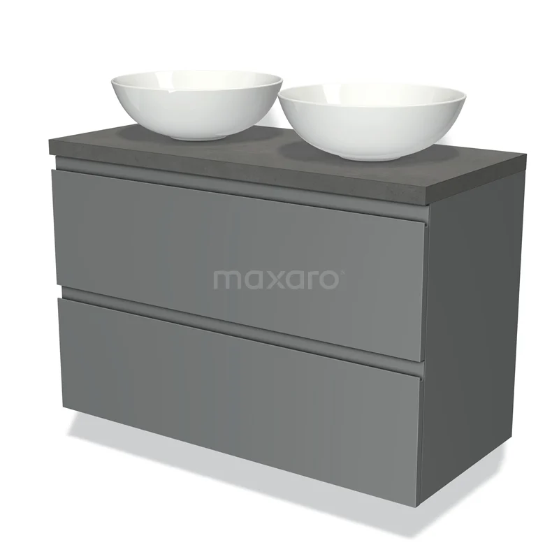 Modulo Plato Badmöbel mit Aufsatzwaschbecken | 100 cm Mittelgrau Grifflos front Dunkelgrauer Beton blatt 2 übereinanderliegende Schubladen