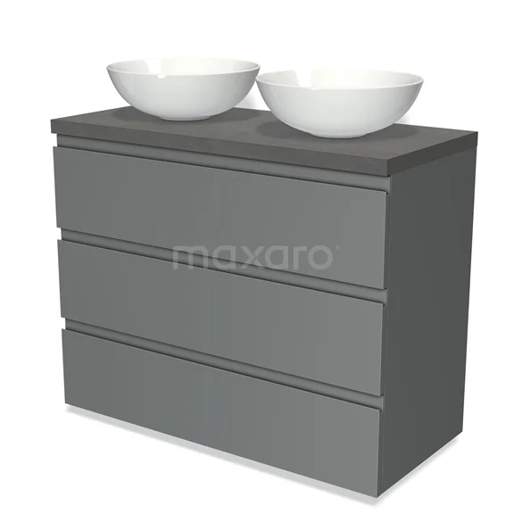 Modulo Plato Badmöbel mit Aufsatzwaschbecken | 100 cm Mittelgrau Grifflos front Dunkelgrauer Beton blatt 3 Schubladen
