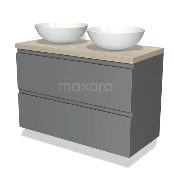 Modulo Plato Badmöbel mit Aufsatzwaschbecken | 100 cm Mittelgrau Grifflos front Hellgraue Eiche blatt 2 übereinanderliegende Schubladen