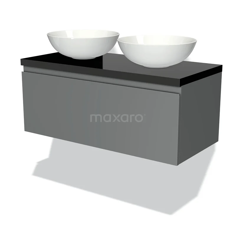 Modulo Plato Badmöbel mit Aufsatzwaschbecken | 100 cm Mittelgrau Grifflos front Hochglanz Schwarz blatt 1 Schublade