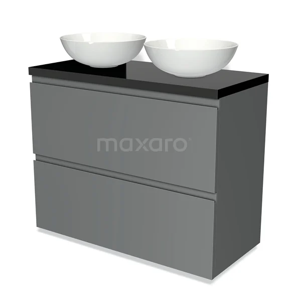 Modulo Plato Badmöbel mit Aufsatzwaschbecken | 100 cm Mittelgrau Grifflos front Hochglanz Schwarz blatt 2 hohe Schubladen übereinanderliegend