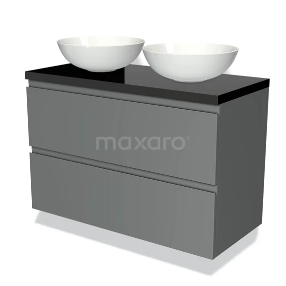 Modulo Plato Badmöbel mit Aufsatzwaschbecken | 100 cm Mittelgrau Grifflos front Hochglanz Schwarz blatt 2 übereinanderliegende Schubladen