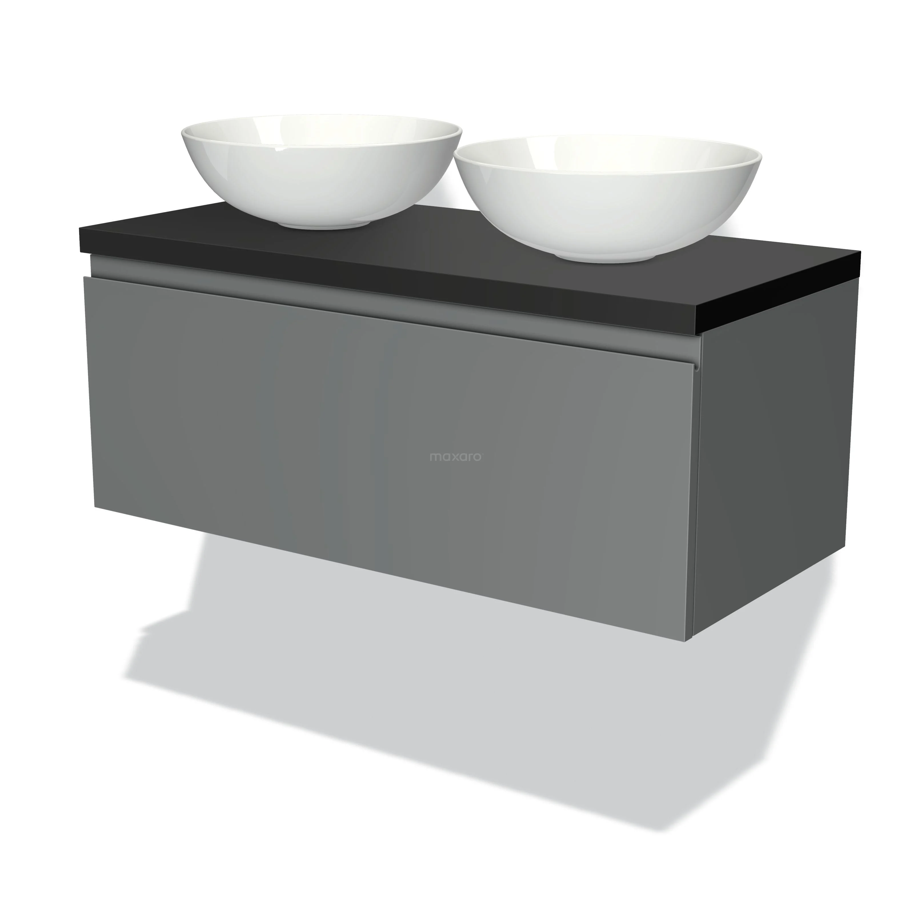 Modulo Plato Badmöbel mit Aufsatzwaschbecken | 100 cm Mittelgrau Grifflos front Matt Schwarz blatt 1 Schublade