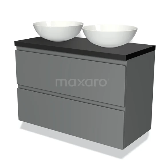 Modulo Plato Badmöbel mit Aufsatzwaschbecken | 100 cm Mittelgrau Grifflos front Matt Schwarz blatt 2 übereinanderliegende Schubladen