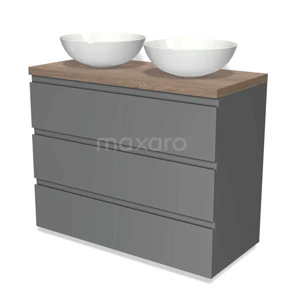 Modulo Plato Badmöbel mit Aufsatzwaschbecken | 100 cm Mittelgrau Grifflos front Mittelbraune Eiche blatt 3 Schubladen
