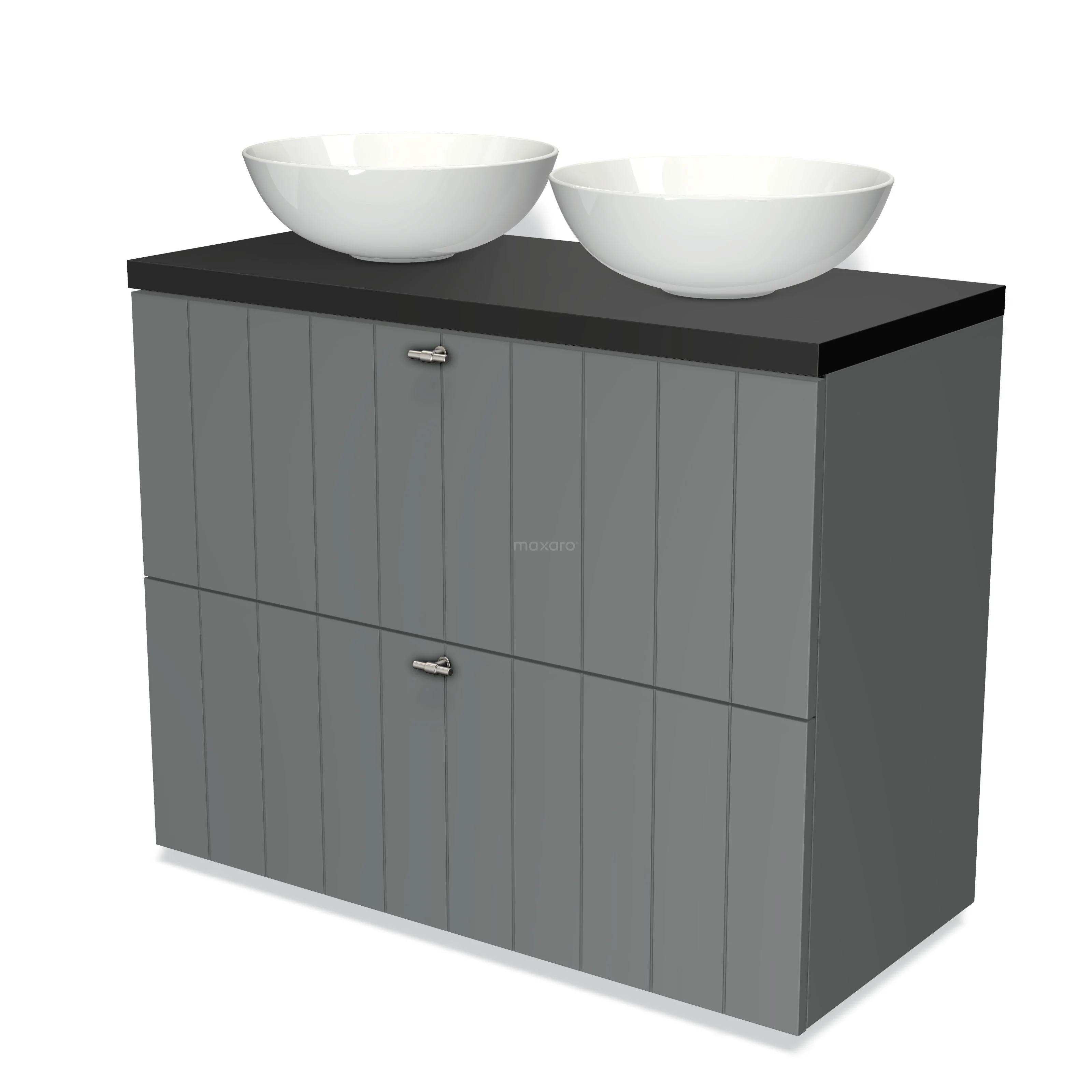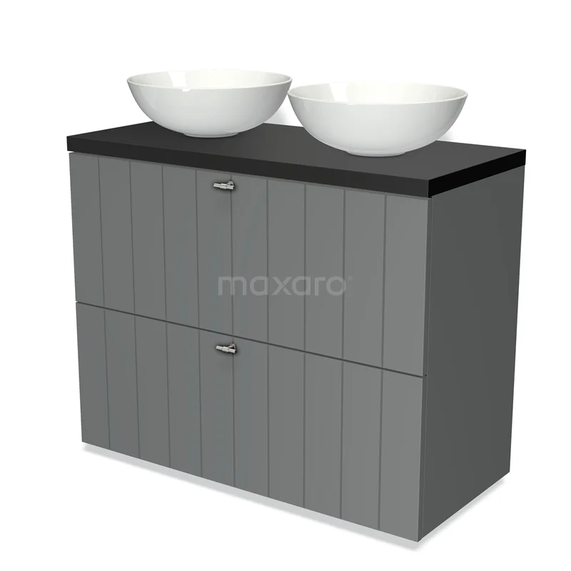 Modulo Plato Badmöbel mit Aufsatzwaschbecken | 100 cm Mittelgrau Lamelle front Matt Schwarz blatt 2 hohe Schubladen übereinanderliegend