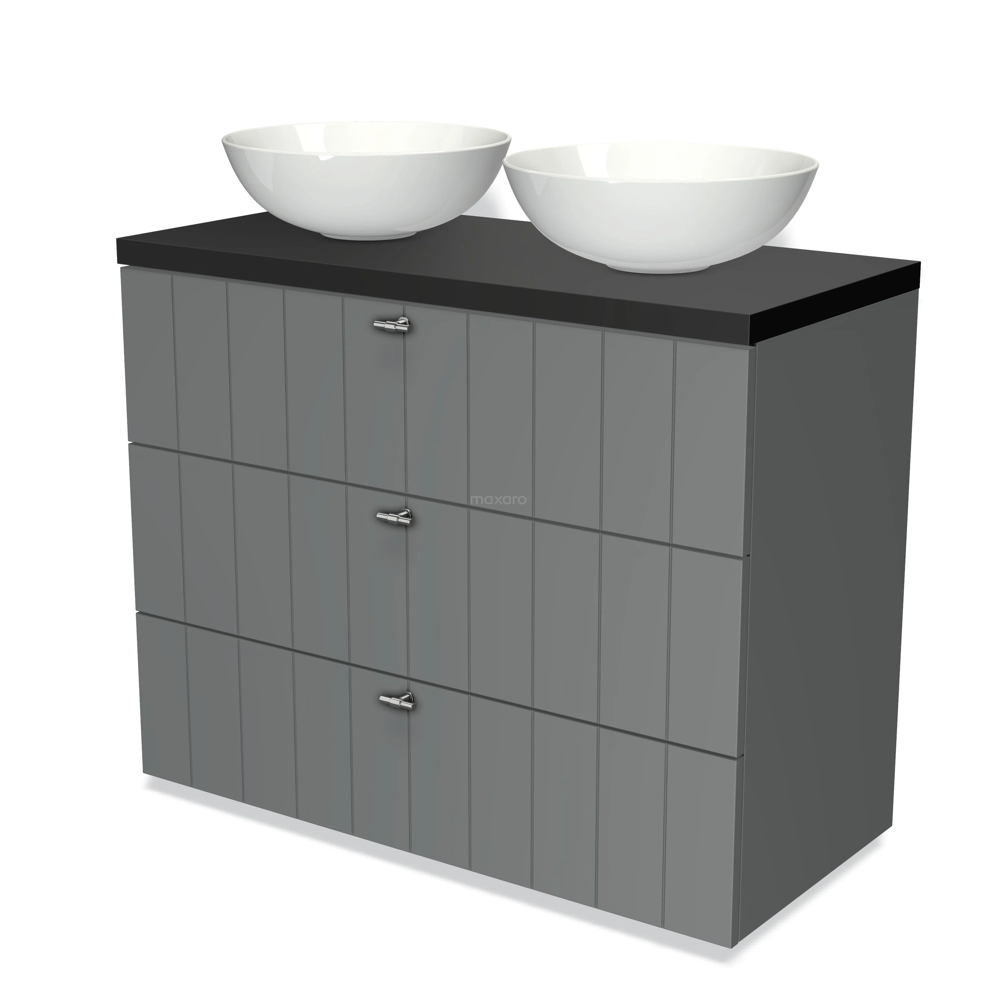 Modulo Plato Badmöbel mit Aufsatzwaschbecken | 100 cm Mittelgrau Lamelle front Matt Schwarz blatt 3 Schubladen