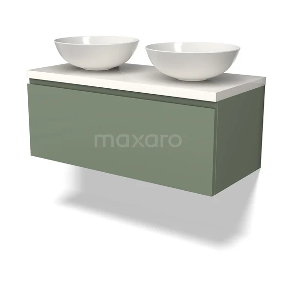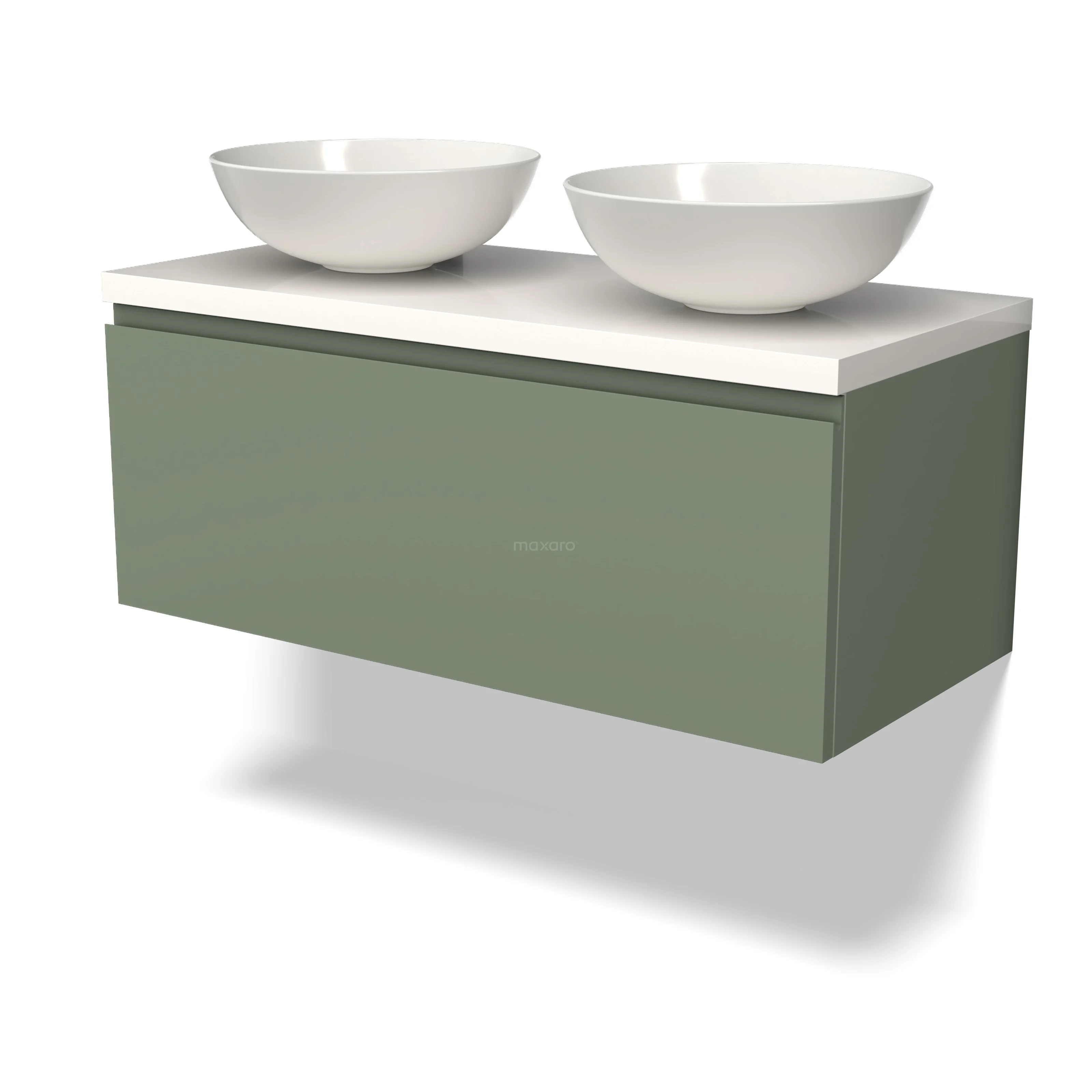 Modulo Plato Badmöbel mit Aufsatzwaschbecken | 100 cm Salbeigrün Grifflos front Hochglanz Weiß blatt 1 Schublade
