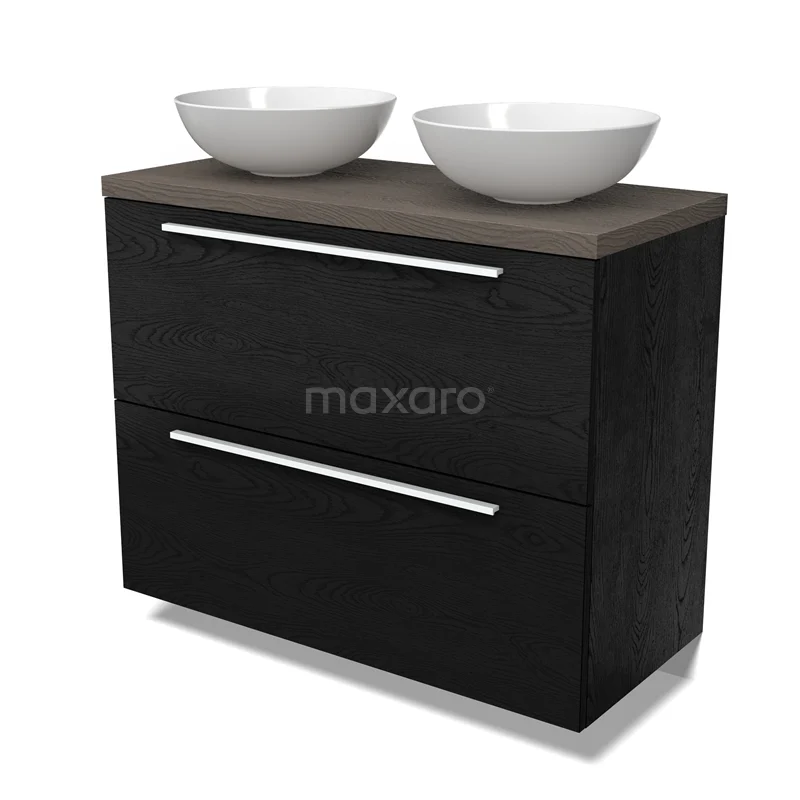 Modulo Plato Badmöbel mit Aufsatzwaschbecken | 100 cm Schwarze Eiche Flach front Dunkelbraune Eiche blatt 2 hohe Schubladen übereinanderliegend