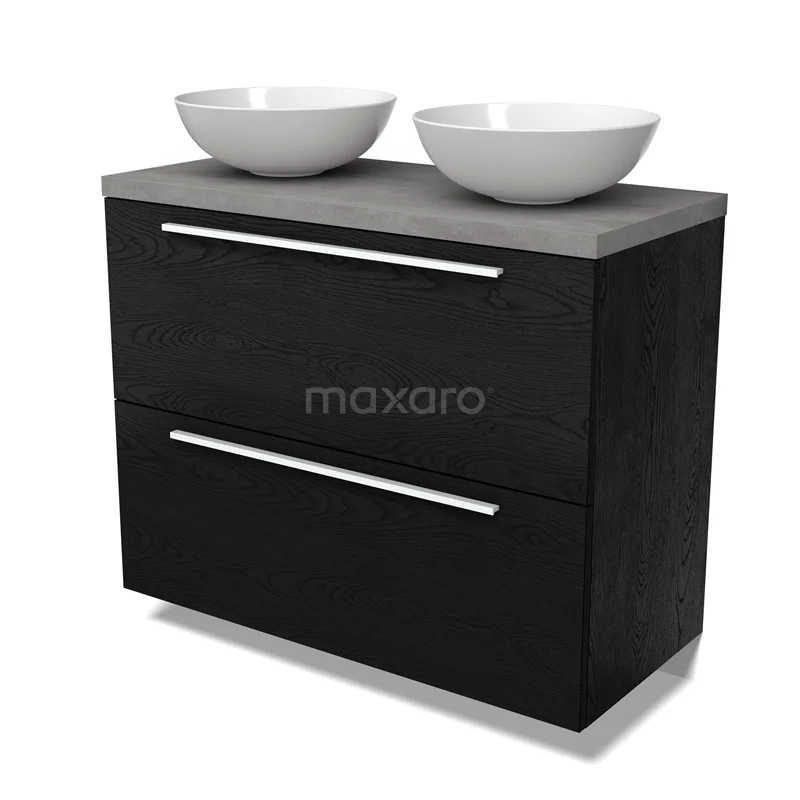 Modulo Plato Badmöbel mit Aufsatzwaschbecken | 100 cm Schwarze Eiche Flach front Hellgrauer Beton blatt 2 hohe Schubladen übereinanderliegend