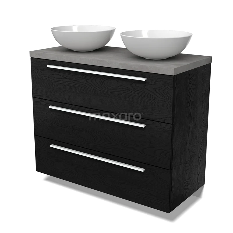 Modulo Plato Badmöbel mit Aufsatzwaschbecken | 100 cm Schwarze Eiche Flach front Hellgrauer Beton blatt 3 Schubladen