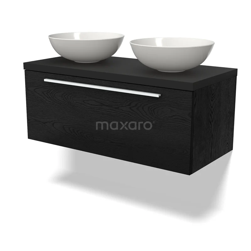 Modulo Plato Badmöbel mit Aufsatzwaschbecken | 100 cm Schwarze Eiche Flach front Matt Schwarz blatt 1 Schublade