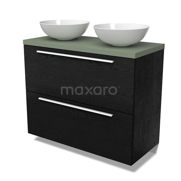 Modulo Plato Badmöbel mit Aufsatzwaschbecken | 100 cm Schwarze Eiche Flach front Salbeigrün blatt 2 hohe Schubladen übereinanderliegend