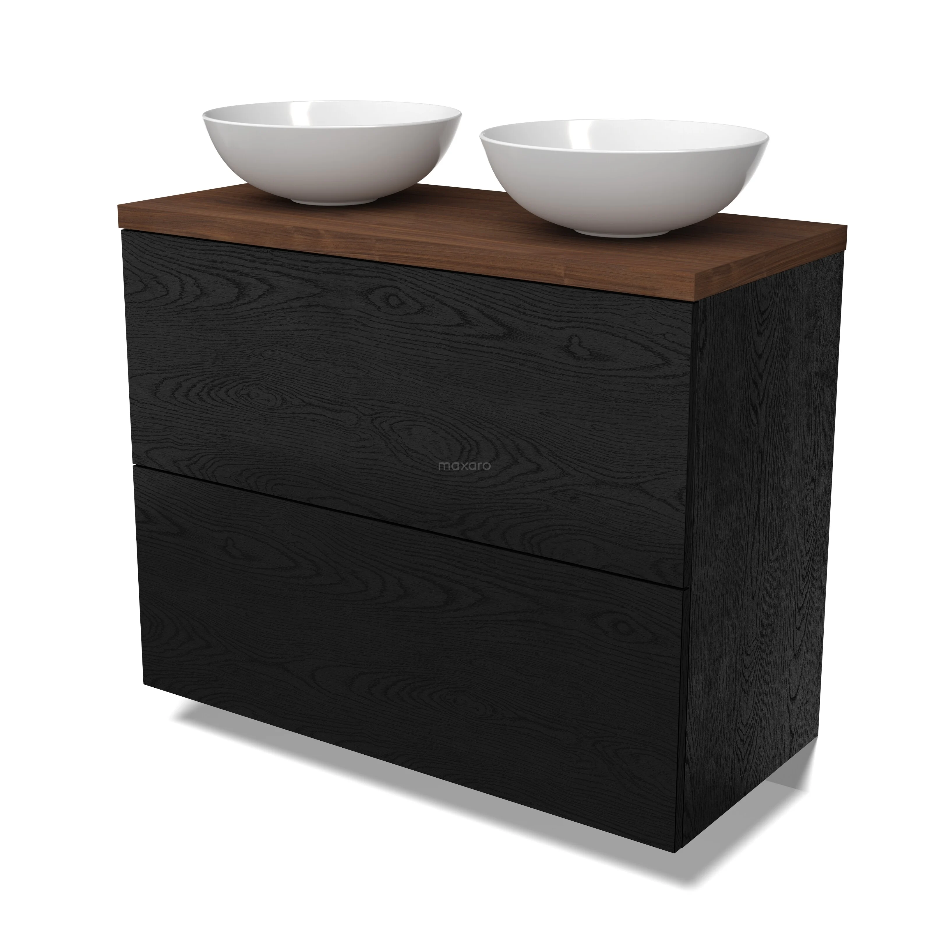 Modulo Plato Badmöbel mit Aufsatzwaschbecken | 100 cm Schwarze Eiche Flach front Walnuss blatt 2 hohe Schubladen übereinanderliegend